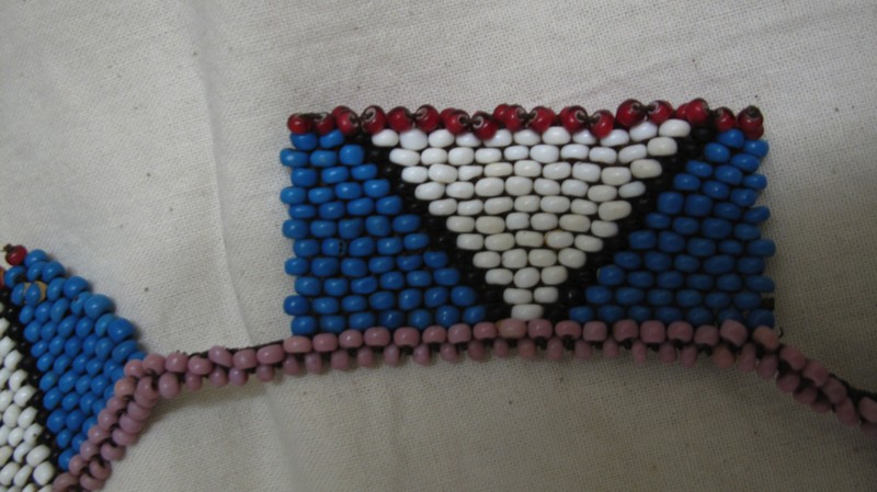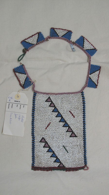 [Source - Chloe Rushovich for FHYA, 2020, transcription of KwaZulu-Natal Museum database extracts: Entry in the Accessions Register (Ethnology Book 1) for Accession 616: "Zulu necklet (ulimi)". Next to this Accession is written: "Moved from Nos 48/49 - 3 specimens": Entry in the Accessions Register (Ethnology Book 1) for Accession 48: "Native bead necklet of various patterns". Next to this listing is written: "Cancelled see Nos 616 & 690". Entry in the Accessions Register (Ethnology Book 1) for Accession 49: "Native bead anklet". So Accession Numbers 48, 49, 616 and 690 are entangled in some way (see notes). Entry in the Accessions Register (Ethnology Book 1) for Accession 690: "Zulu necklaces constituting a letter. Zulu name Umampapeni. - not in dictionary [later addition in a different handwriting]. (The idea of the cross was attained from the Red Cross on hospital trains and wagons.)."]