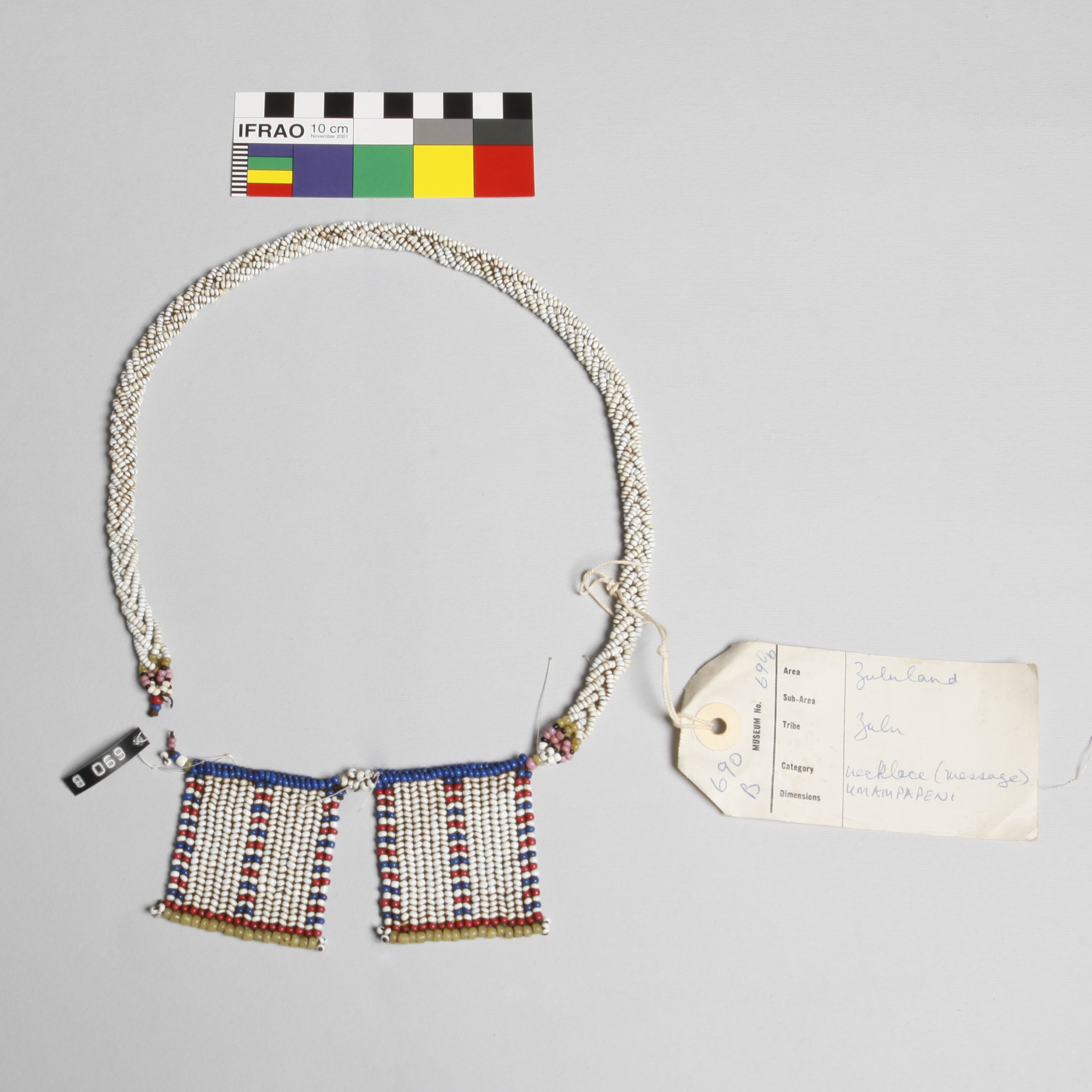 [Source - Chloe Rushovich for FHYA, 2020, transcription of KwaZulu-Natal Museum database extracts: Entry in the Accessions Register (Ethnology Book 1) for Accession 690: "Zulu necklaces constituting a letter. Zulu name Umampapeni. - not in dictionary [later addition in a different handwriting]. (The idea of the cross was attained from the Red Cross on hospital trains and wagons.)." This Accession may be made up of items previously grouped under other Accession Numbers (see notes): Entry in the Accessions Register (Ethnology Book 1) for Accession 616: "Zulu necklet (ulimi)". Entry in the Accessions Register (Ethnology Book 1) for Accession 48: "Native bead necklet of various patterns". Entry in the Accessions Register (Ethnology Book 1) for Accession 49: "Native bead anklet".]