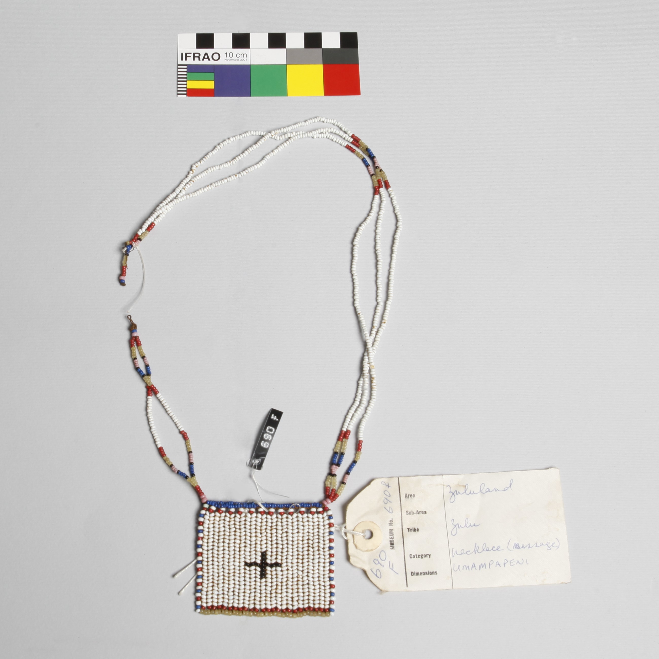 [Source - Chloe Rushovich for FHYA, 2020, transcription of KwaZulu-Natal Museum database extracts: Entry in the Accessions Register (Ethnology Book 1) for Accession 690: "Zulu necklaces constituting a letter. Zulu name Umampapeni. - not in dictionary [later addition in a different handwriting]. (The idea of the cross was attained from the Red Cross on hospital trains and wagons.)." This Accession may be made up of items previously grouped under other Accession Numbers (see notes): Entry in the Accessions Register (Ethnology Book 1) for Accession 616: "Zulu necklet (ulimi)". Entry in the Accessions Register (Ethnology Book 1) for Accession 48: "Native bead necklet of various patterns". Entry in the Accessions Register (Ethnology Book 1) for Accession 49: "Native bead anklet".]