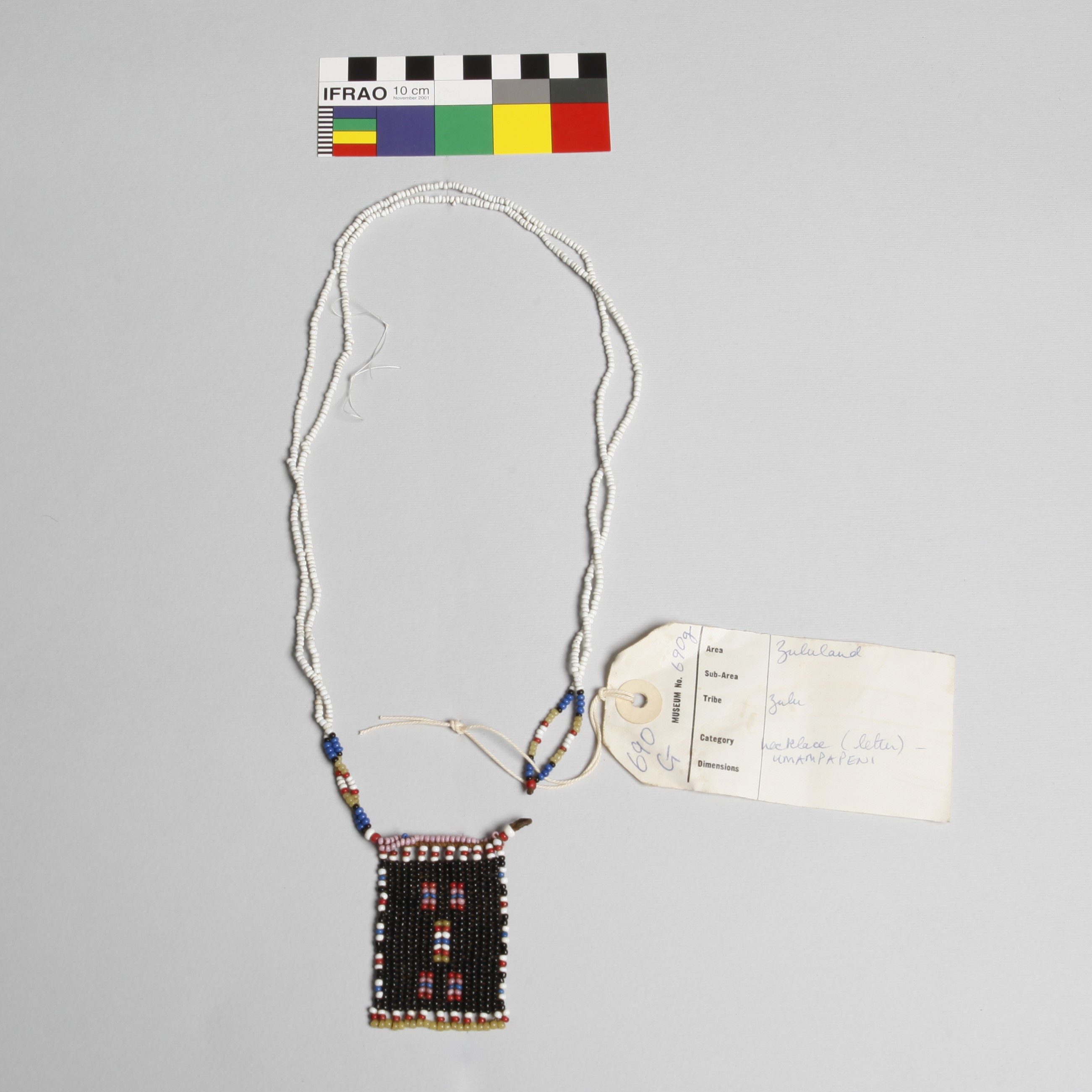 [Source - Chloe Rushovich for FHYA, 2020, transcription of KwaZulu-Natal Museum database extracts: Entry in the Accessions Register (Ethnology Book 1) for Accession 690: "Zulu necklaces constituting a letter. Zulu name Umampapeni. - not in dictionary [later addition in a different handwriting]. (The idea of the cross was attained from the Red Cross on hospital trains and wagons.)." This Accession may be made up of items previously grouped under other Accession Numbers (see notes): Entry in the Accessions Register (Ethnology Book 1) for Accession 616: "Zulu necklet (ulimi)". Entry in the Accessions Register (Ethnology Book 1) for Accession 48: "Native bead necklet of various patterns". Entry in the Accessions Register (Ethnology Book 1) for Accession 49: "Native bead anklet".]