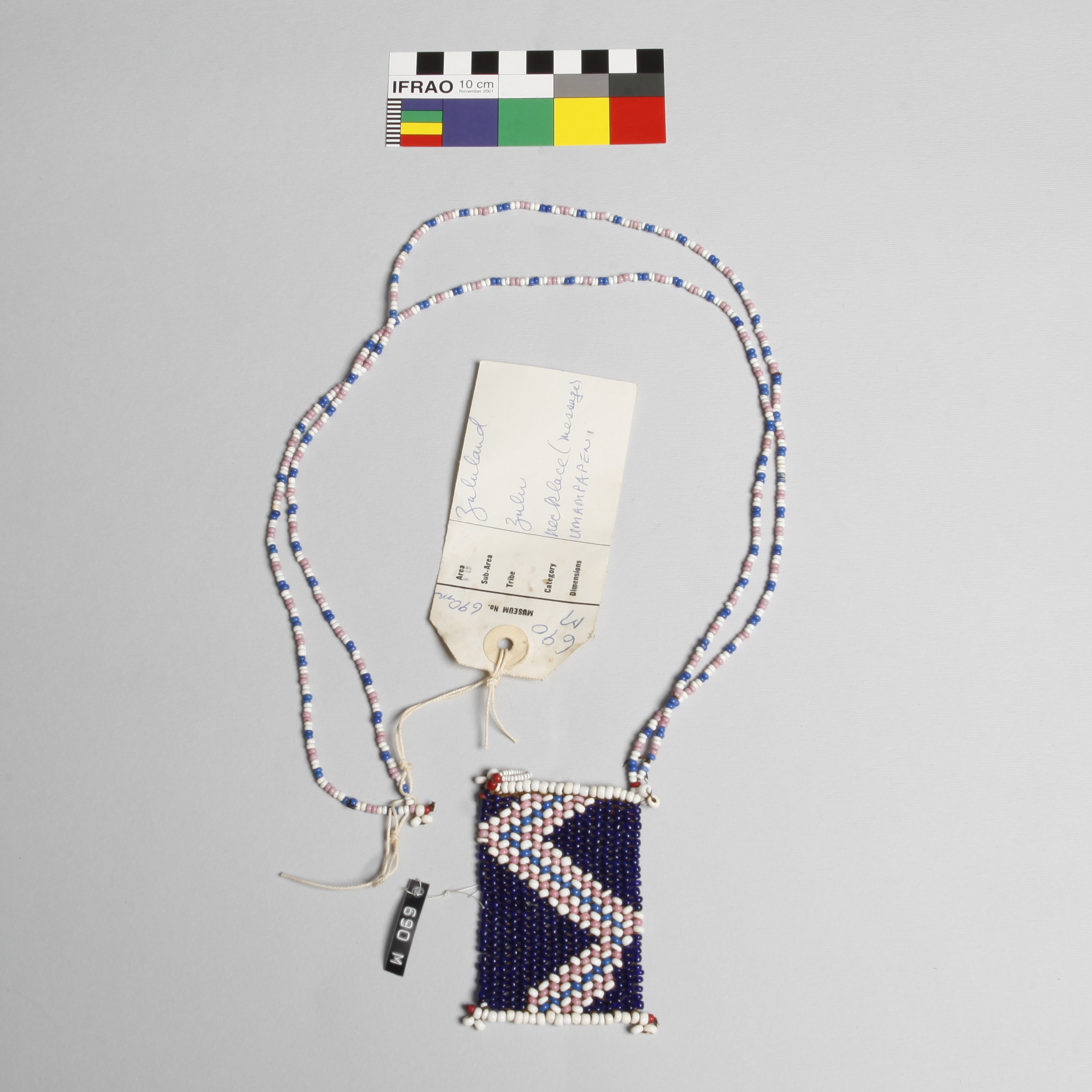 Additional information [Source - Chloe Rushovich for FHYA, 2020, transcription of KwaZulu-Natal Museum object detail catalogue material: Collection: Anthropology Accession #: 00690 Othername: "umampapeni" Received as: Purchase Received date: 1906 Catalogued by: Jeremiah Cullingworth Source: Franz Mayr, possibly Publication: Ann. Natal Museum Vol 1, pp. 159-165: 'Language of colours amongst the Zulus expressed by their bead-work ornaments; and some general notes on their personal adornments and clothing'. By Franz Mayr, but only 690C is illustrated in this publication (Fig. 2). Archival history: See notes in the Accession Record. People: Mayr, Franz Material: Cat. Card: "?Fibre thread. Beads: blue, navy, pink, white" Provenance: Zululand]
