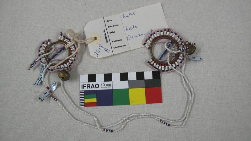 KZNM metadata [Source - Chloe Rushovich for FHYA, 2016, using KwaZulu Natal Museum Catalogue Card: Cultural Affinity: Lala Provenance: Natal Raw materials: Brass curtain rings. ? sinew thread. Beads - red, black, white, pink, blue Method Obtained: Purch. Father Mayr 1912]