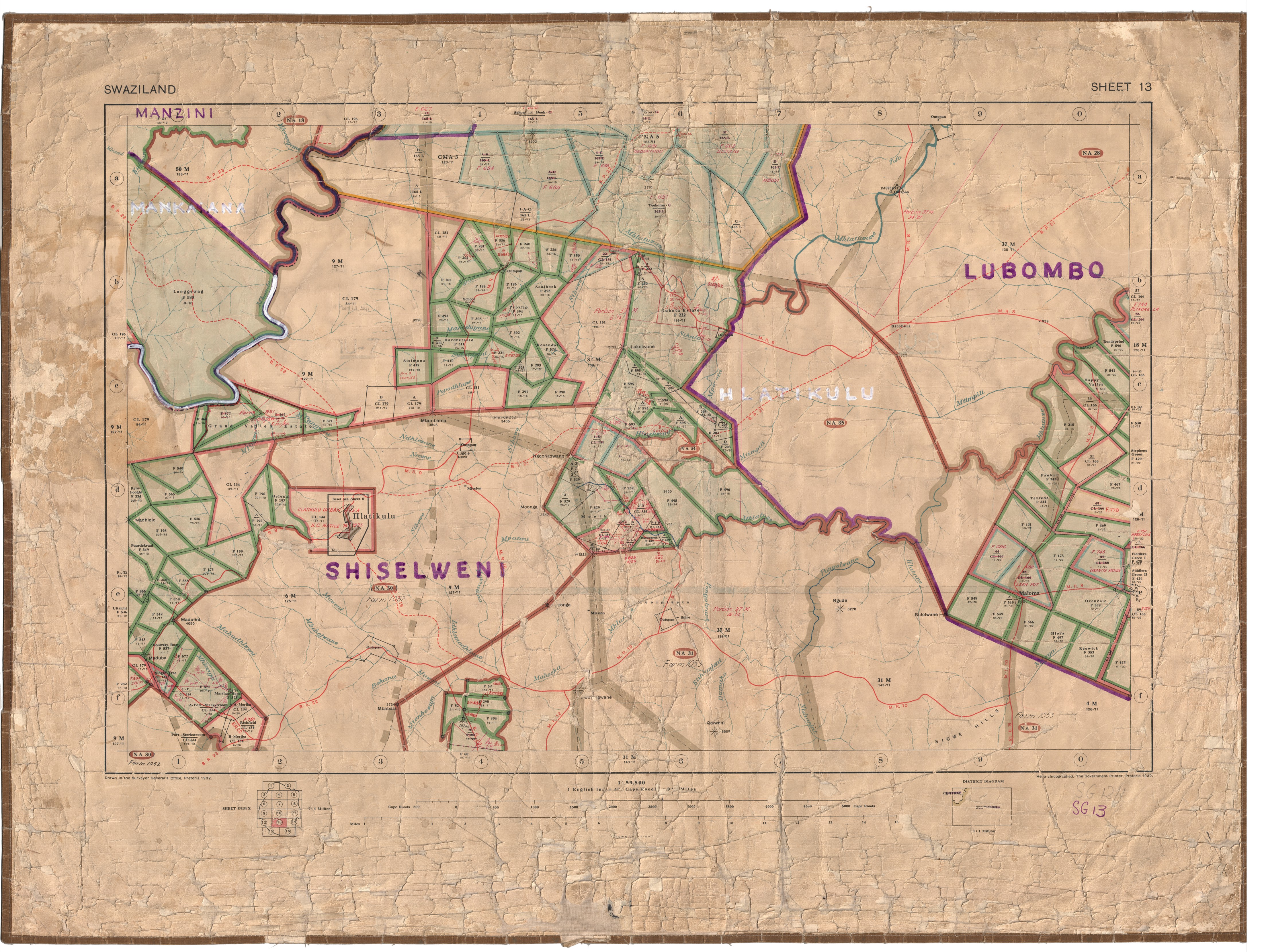 [Source - Carolyn Hamilton for FHYA, 2017: These maps were discarded by the Government of the Kingdom of Swaziland's Surveyor General, and given to the Swaziland National Archives in Lobamba. The Swaziland National Archives did not want to maintain custody of the maps, and offered them to Carolyn Hamilton and Philip Bonner, who were working in the area on the Swaziland Oral History Project.]
