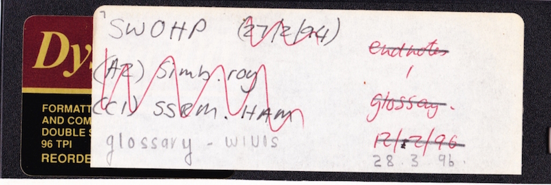 Transcription [Source - Chloe Rushovich for FHYA, 2021, using the SWOHP floppy disk labels: First line on left of label "SWOHP Back-up" Crossed out on second line on left of label "d2 - f2" Crossed out on third line on left of label "d2 - f3" Crossed out on first line on right of label "13/11/95" Crossed out on second line on right of label "22/11/96" Third line on right of label 28.3.96"]