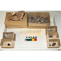 [Source - Chloe Rushovich for FHYA, 2019: File contains material identified by eThembeni Cultural Heritage Management for FHYA using KZNM materials as 'unanalysed bone', a box with markings, and an index card]