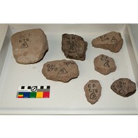 [Source - Chloe Rushovich for FHYA, 2019: File contains material identified by eThembeni Cultural Heritage Management for FHYA using KZNM materials as 'hut floor fragments', a box with markings, and an index card]