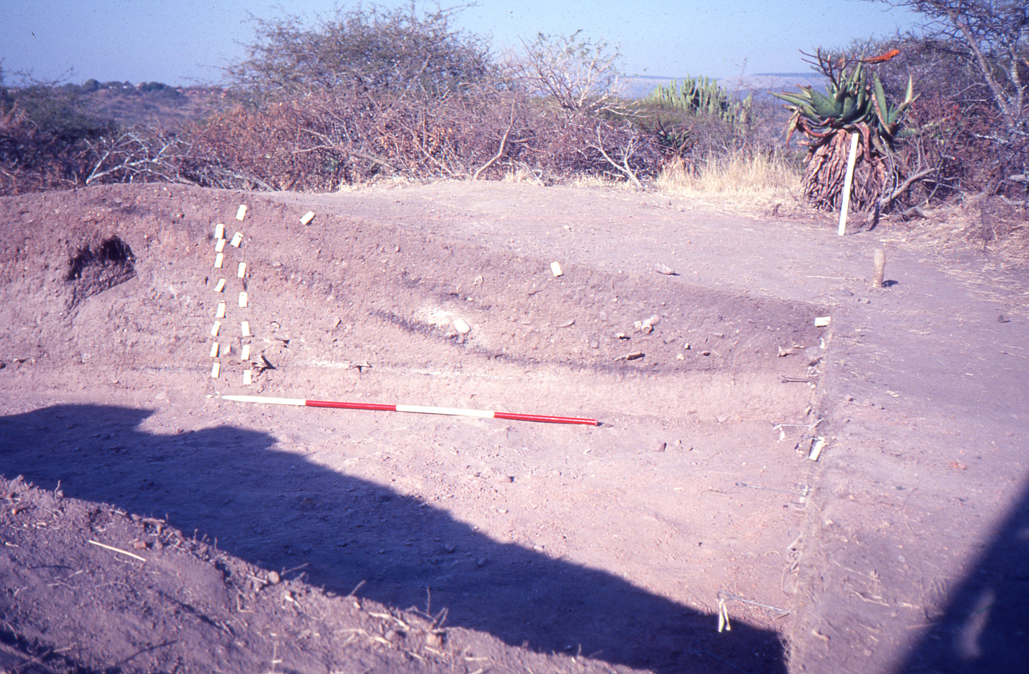 Attributions and conjectures [Source - Chloe Rushovich, 2019, for FHYA using information provided by Gavin Whitelaw: Slide of photograph of a midden excavation at uMgungundlovu (national site number 2831AD 004) taken by Martin Hall in 1978. Hall took a series of photographs of the 1978 field school excavations run by Oliver Davies.]