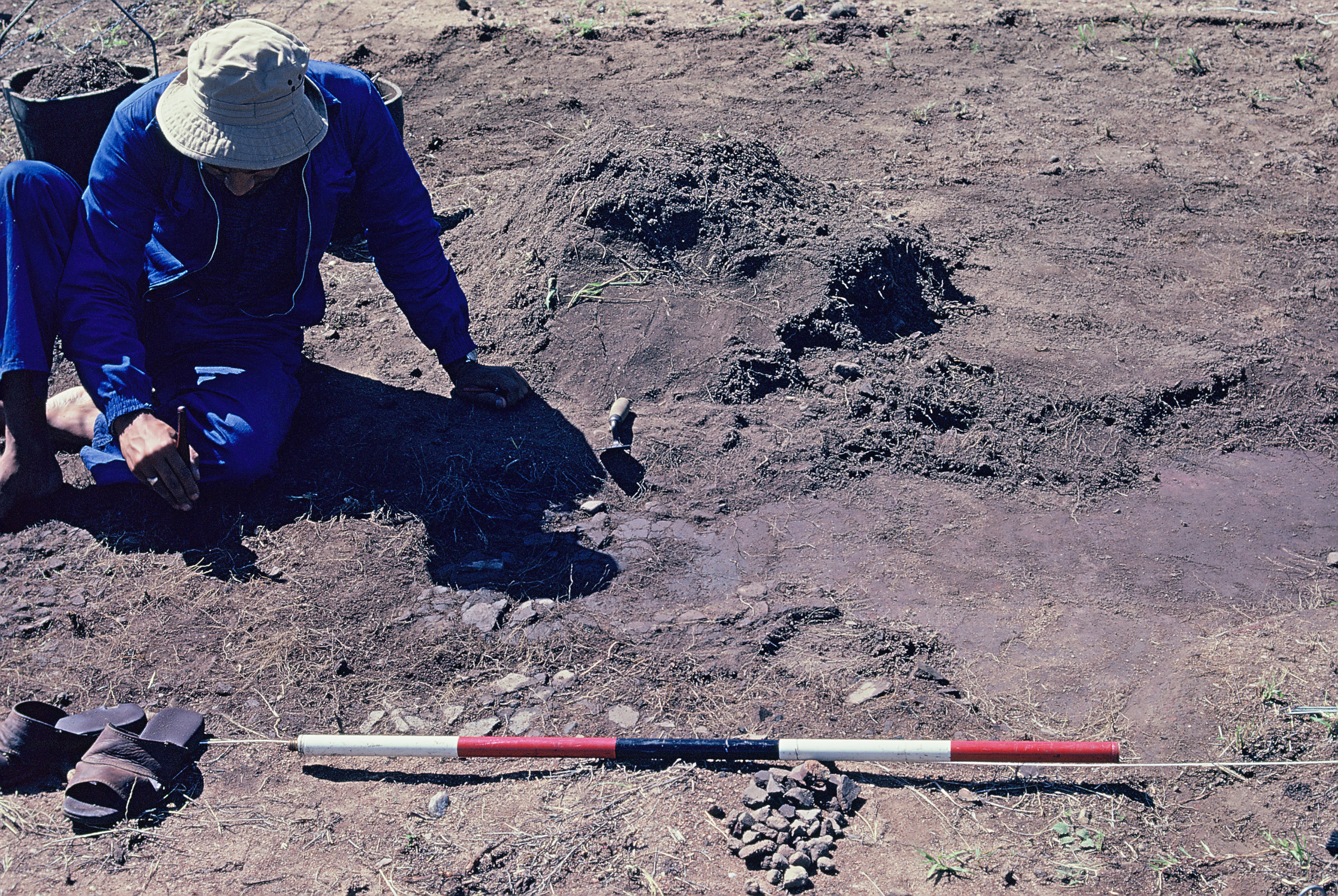 Attributions and conjectures [Source - Chloe Rushovich for FHYA, 2020, using Tim Maggs's materials: Image depicts an archaeological worker and a measuring stick at the uMgungundlovu archaeological site.]
