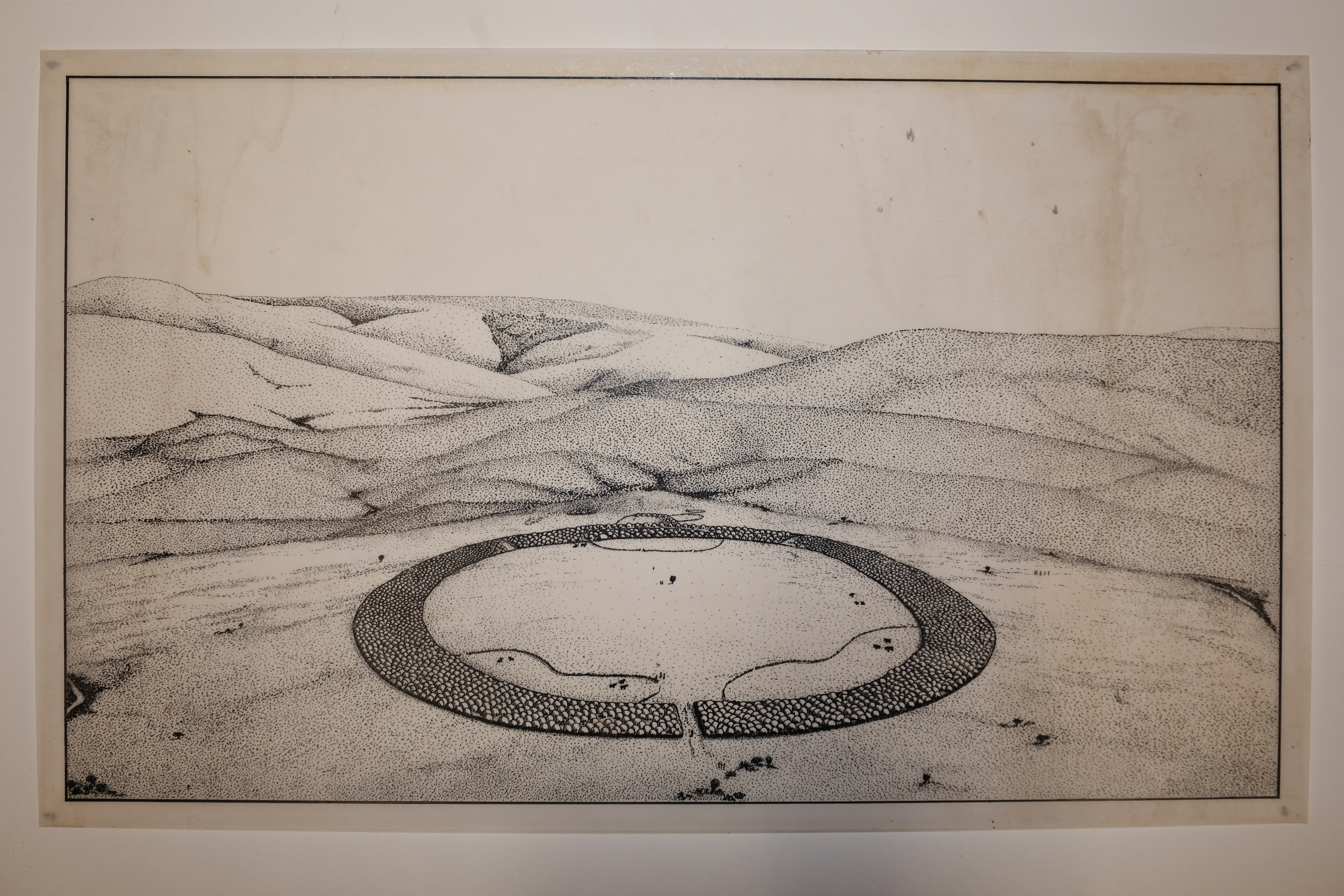Attributions and conjectures [Source - Frans Roodt for FHYA, 2020: Frans Roodt directed Hester Roodt (nee Lewis) to do this landscape drawing in 1989. The image is an early attempt to compose a perspective drawing of uMgungundlovu. It is based on an aerial photo, taken at about a 30-degree angle from a light aircraft flying over the site, providing a view from north to south. The size is based on the archaeological site plan.The hills in the background are realistic. The internal layout was further based on the sketch by James Stuart (published in Stuart, J & McMalcolm, D. (Eds) 1969. The diary of Henry Fancis Fynn. Pietermaritzburg. Shuter and Shooter). In retrospect, the hut numbers are probably over exaggerated. The total hut numbers range from: - 1100 huts according to Captain Allen Gardiner (Gardiner, AF. 1966. Narrative of a Journey to the Zulu Country in South Africa. Cape Town. C. Struik); - 1700 huts according to Piet Retief during his first visit to Mgungundlovu in 1837 (The Grahamstown Journal: 1837.12.28:3); and - 2500 huts were estimated by Joseph Kirkman, interpreter assigned to the Reverend George Champion while at Mgungundlovu. (Also see Lawton, J. 1959. Plan of Dingaan's hut groups and reconstruction of Dingaan's hut, Dingaan's Kraal. Unpublished report to the National Monuments Council.)]
