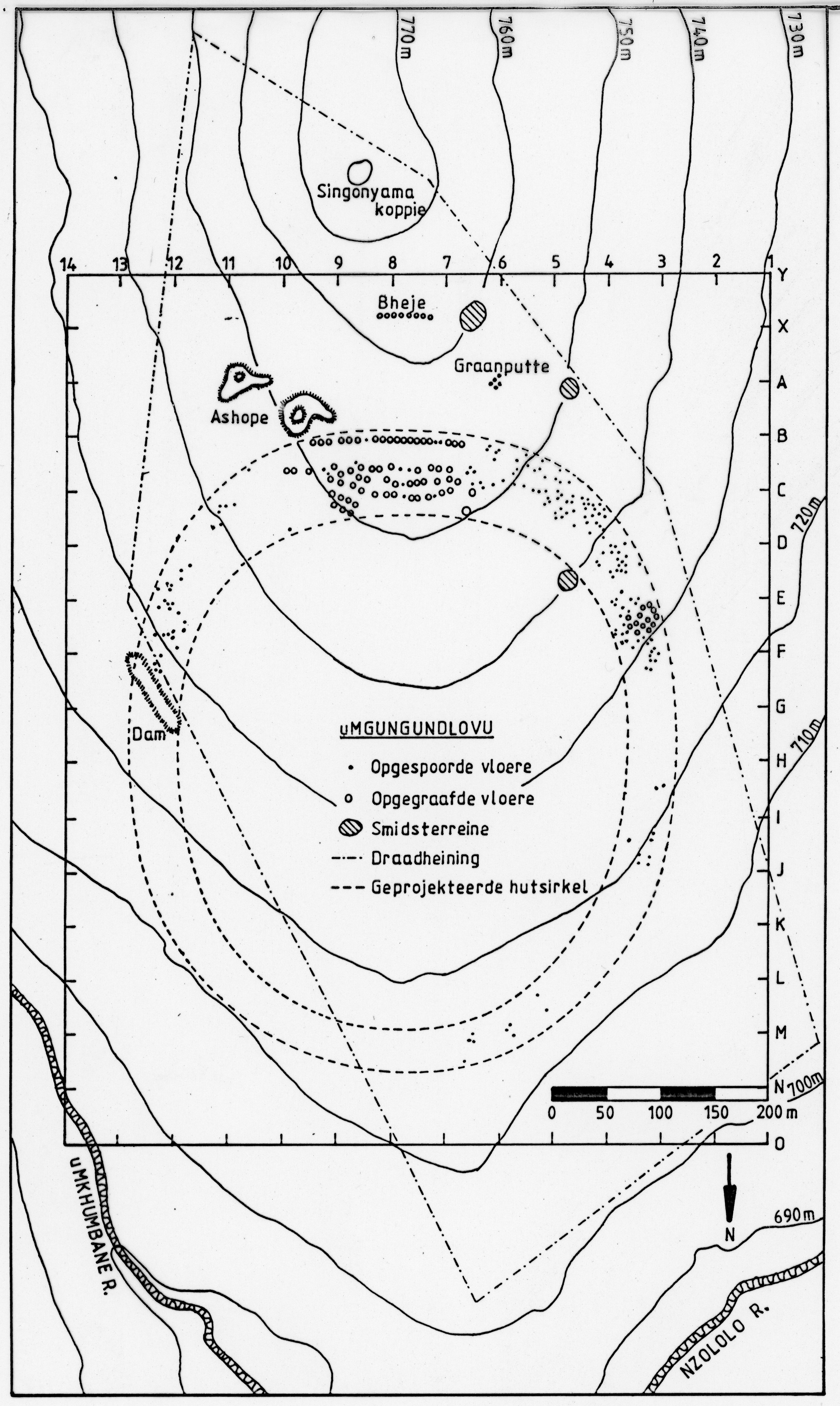 Attributions and conjectures [Source - Frans Roodt for FHYA, 2020: This drawing shows all the features on the uMgungundlovu site as surveyed in 1987-88 from a southward orientation. This drawing lacks the full grid system which is displayed in uMgungundlovu Site Plan 001, but shows the same features. The text on this drawing is in Afrikaans.]