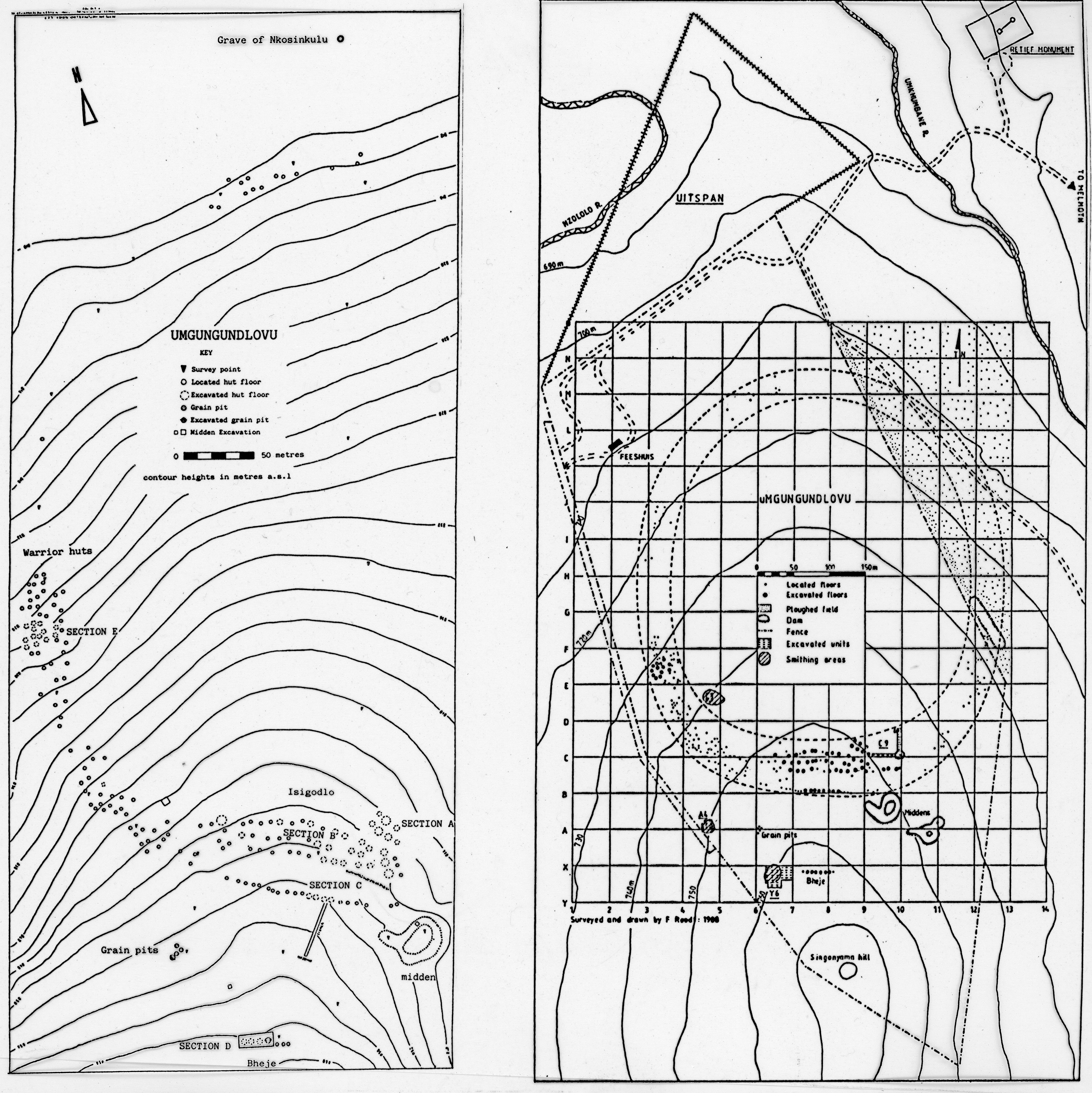 Attributions and conjectures [Source - Frans Roodt for FHYA, 2020: On the left is the site plan of from John Parkington and Mike Cronin's 1979 publication. The north arrow is orientated toward magnetic north. On the right is a more extensive version of uMgungundlovu Site Plan 001, which includes the Retief monument. The plan is orientated toward true north. The scales are different.]